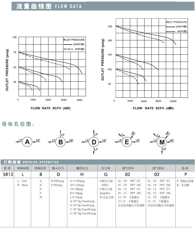 单级式减压结构母体与膜片采用硬密封形式母体螺纹:1/2" NPT(F) 压力表、安全阀接口1/4NPT(F)内设过滤网可采用面板式或墙式安装适用范围:实验室 /气体吹扫系统 /腐蚀性气体 /、特种气体/气体汇流排 /测试设备特性参数最大输入压力:500,3000psig输出压力:0-25,0-50,0-100 0-125,0-250psig安全测试压力:1.5倍的最大输入压力使用温度:-40℉~+165℉(-40℃~+74℃Cv值:1.1材质:上盖:316,Brass母体:316L,Brass膜片:Hastelloy , 316L过滤网:PCTEE,PTEE弹簧:316L阀芯顶杆:316L